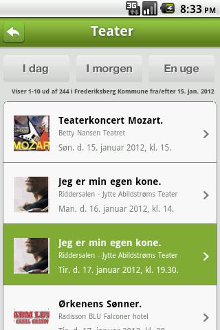 Frederiksberg kommune har lansert en app om kommunens kulturtilbud som har et usedvanlig oversiktlig brukergrensesnitt. Kulturen deles inn i seks kategorier og trykker man på en kategori dukker dagens tilbud opp, med mulighet for å velge tilbudet i morgen eller for hele uken. Nederst kan man trykke seg tilbake til forsiden, til kart eller søkefunksjon. Siden for det enkelte arrangement er også holdt i rent design, med svart tekst på hvit bakgrunn. Du kan bli minnet om et arrangement ved å sende ditt telefonnummer, men skal huskelappen direkte inn på kalenderen må du ha kalenderen til den danske virksomheten CirCal. Den appen får du her.